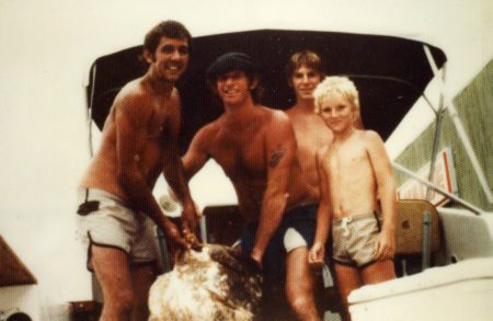 Roger wears a cap in this photograph, taken in his younger days with his good buddy, Frank Keen (left). They hold up a giant jewfish shot with a spear gun while diving in the Atlantic Ocean offshore from St. Augustine.
